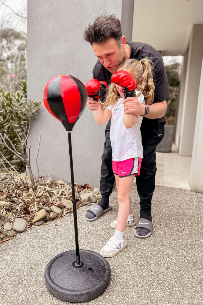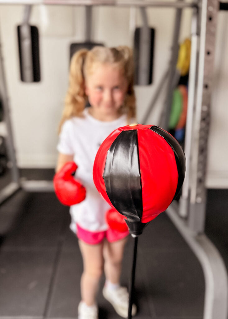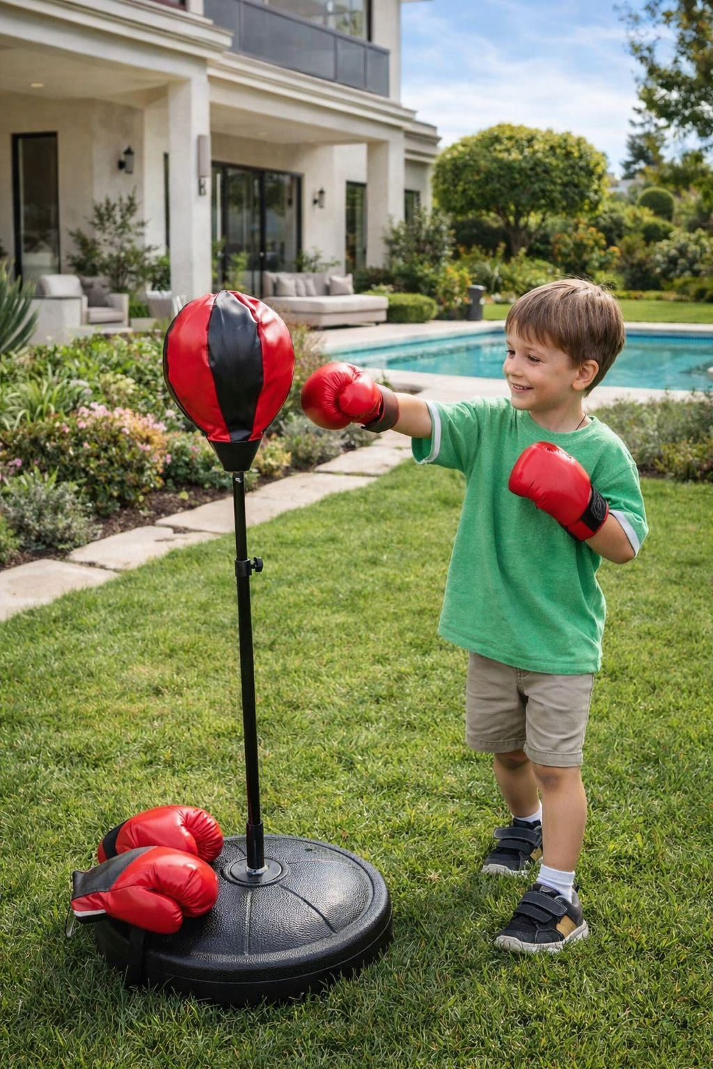 The Boxing Training Set for Kids is a complete boxing-style play kit designed for active indoor and outdoor play. It includes an air-filled punching bag, boxing gloves and focus pads, paired with a weighted base that can be filled with sand or water for adjustable stability.