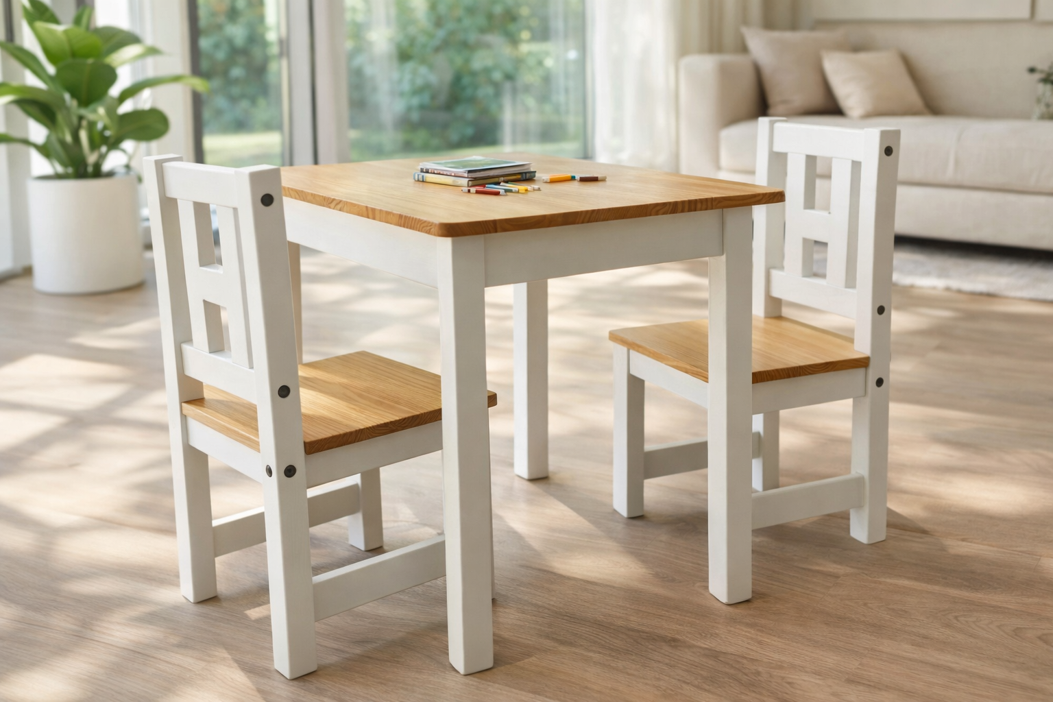 This kids table and chairs set gives children a comfortable place for drawing building and quiet activities. The proportions are designed for young kids so they can sit comfortably and play independently.