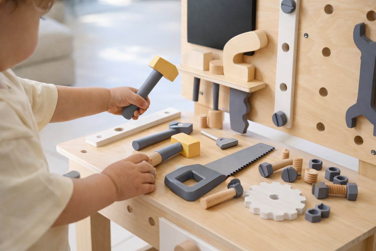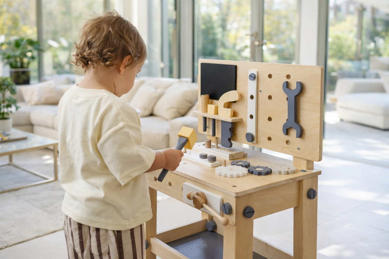 Inspire creativity and hands-on play with the Wooden Work Bench Tool Station. This child-sized workshop includes a variety of play tools and accessories designed for imaginative building and pretend projects.