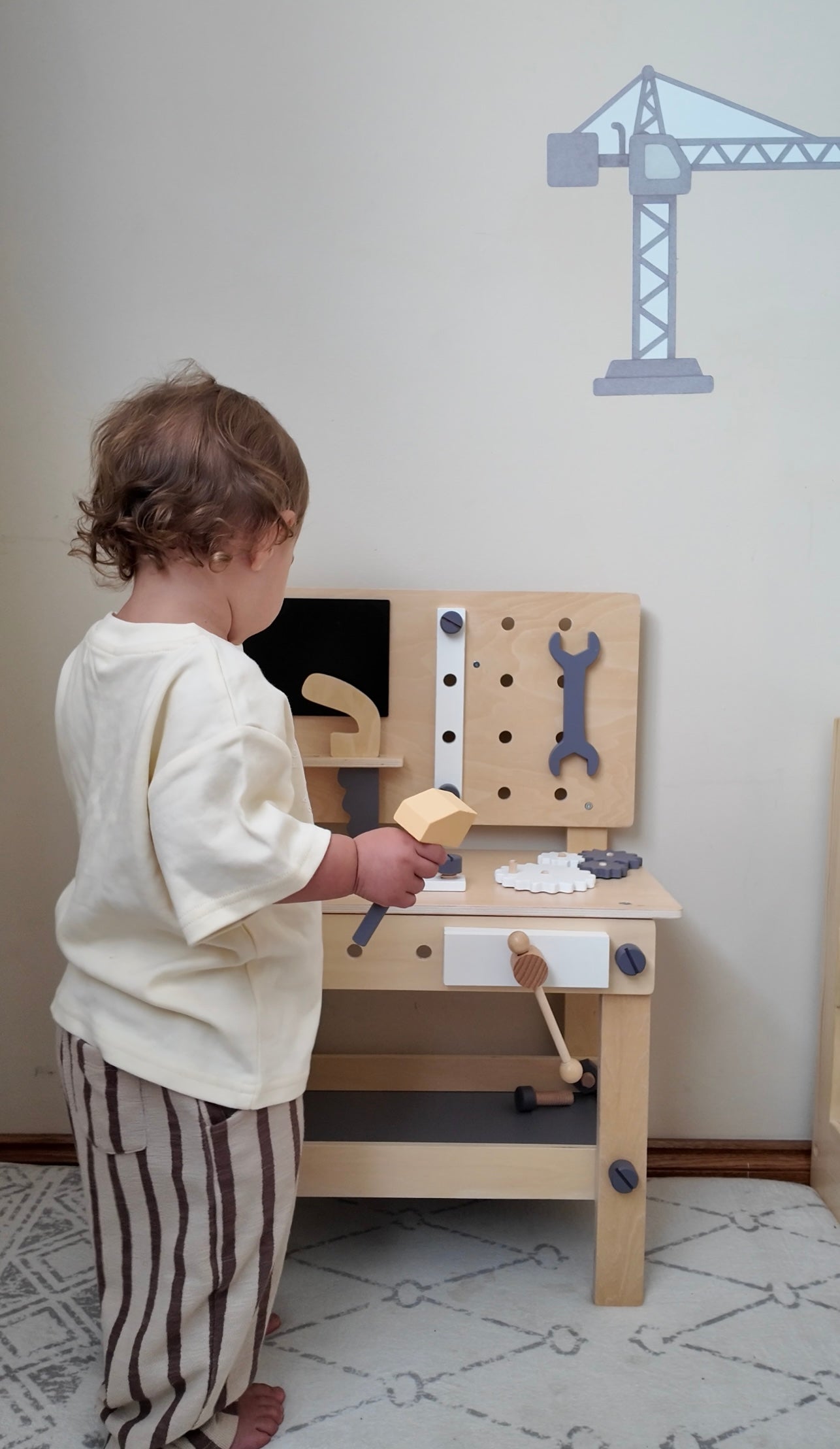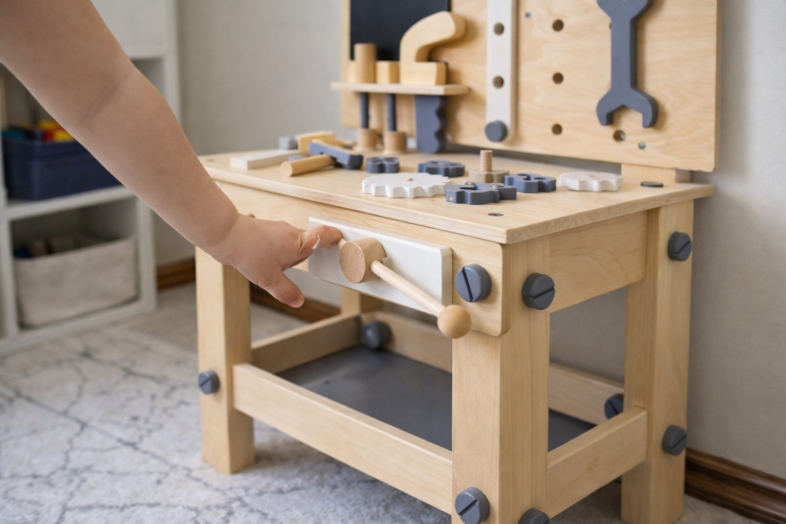 Made from MDF and solid wood with non-toxic paint, the bench provides a sturdy space for little makers to explore and play. With tools including a hammer, wrench, screwdriver, saw, bolts, and a vice, children can enjoy endless creative role play.